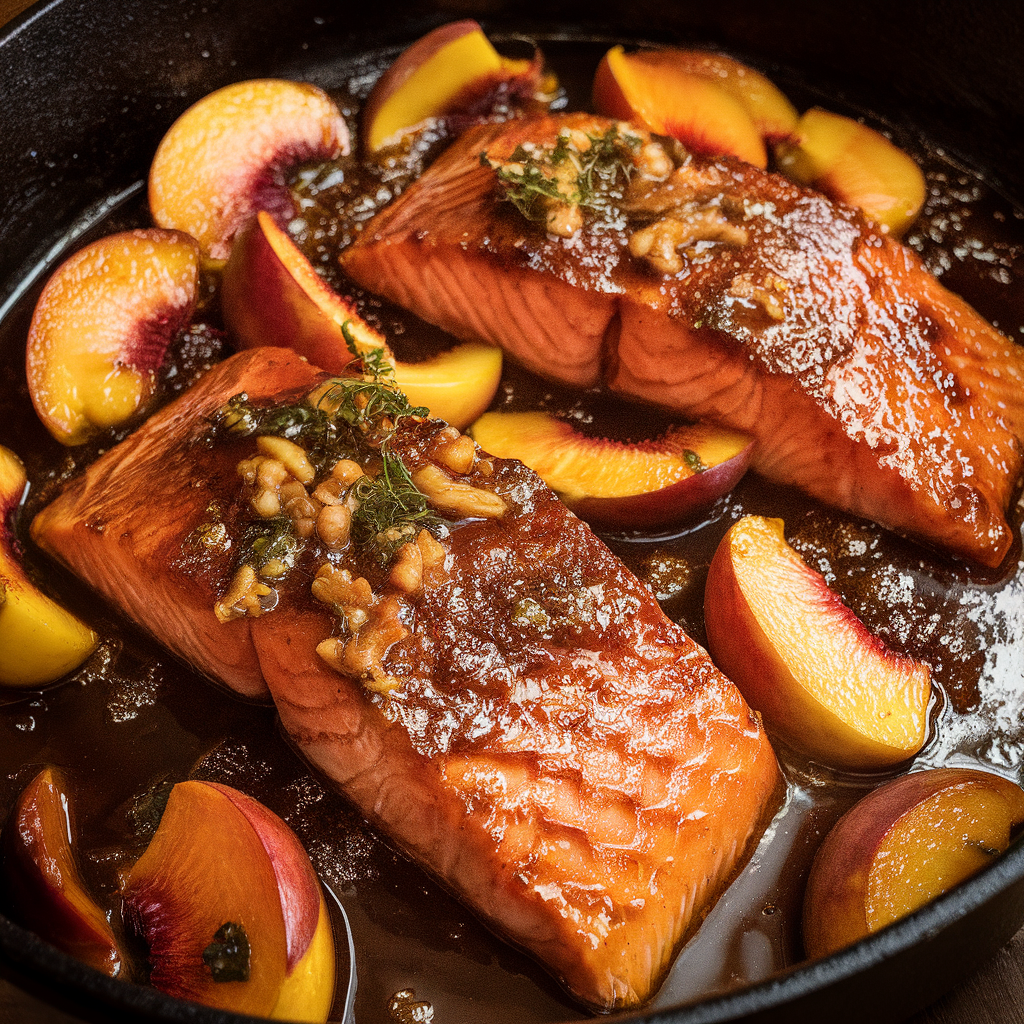 - Add the Glaze: Spoon the peach-bourbon glaze generously over the salmon fillets.